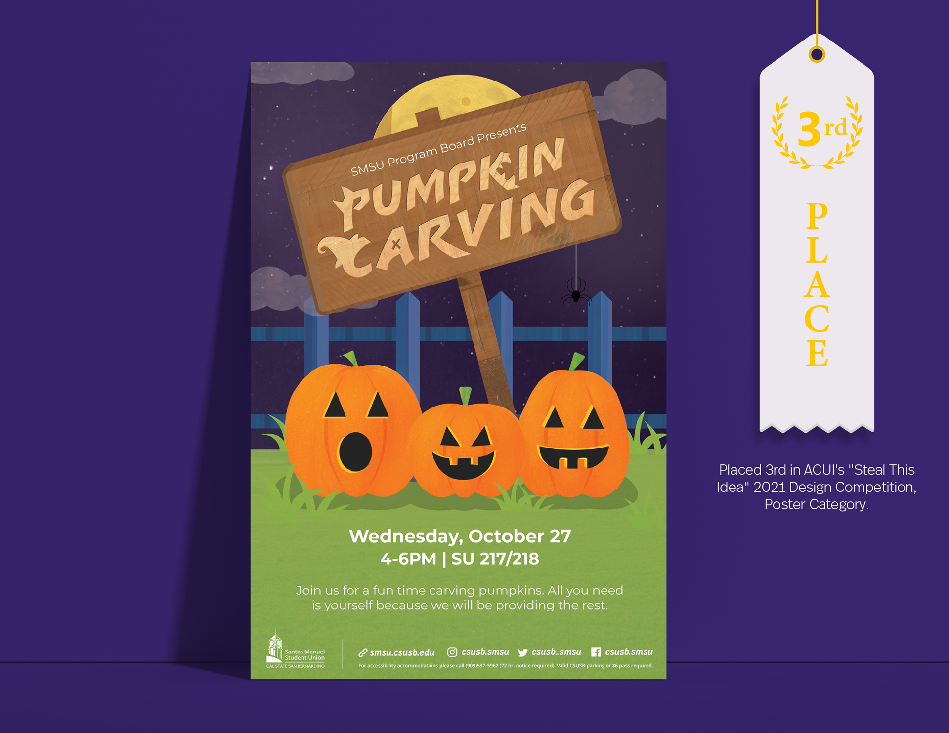 Seasonal pumpkin carving event organized by Program Board. Initial illustrations began in Adobe Illustrator and were further developed with texture overlays and blending modes in Adobe Photoshop.